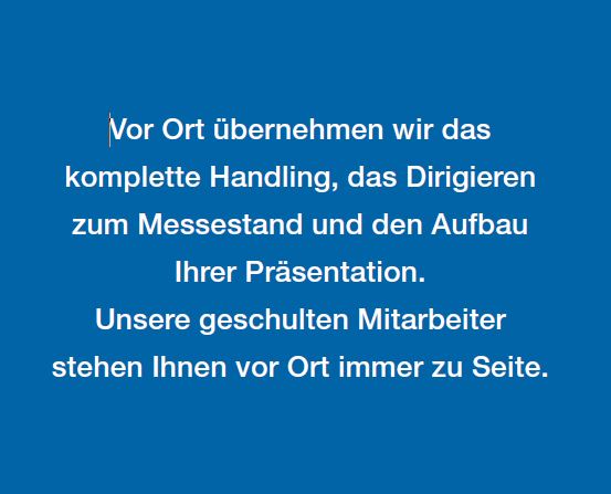 Vor Ort übernehmen wir das komplette Handling, das Dirigieren zum Messestand und den Aufbau Ihrer Präsentation. Unsere geschulten Mitarbeiter stehen Ihnen vor Ort immer zur Seite.