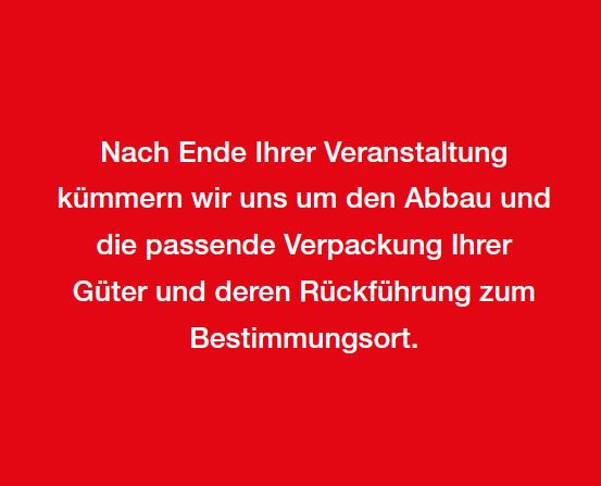 Nach Ende Ihrer Veranstaltung kümmern wir uns um den Abbau und die passende Verpackung Ihrer Güter und deren Rückführung zum Bestimmungsort.